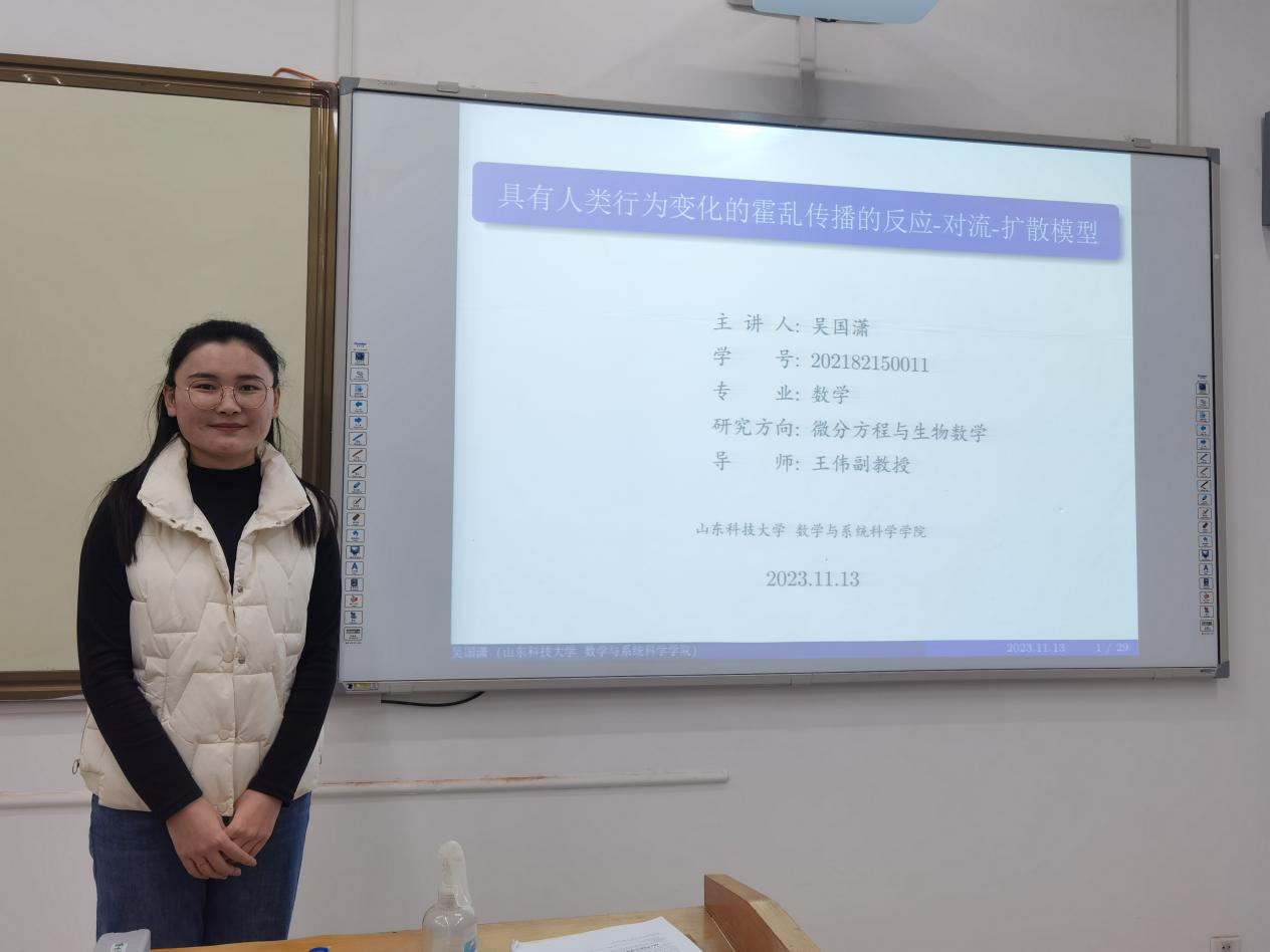 11月13日晚,bevictor伟德,伟德bevictor中文版——研究生讲坛第204期在J5-304成功举行。bevictor伟德2021级2班吴国潇作了题为《具有人类行为变化的霍乱传播的反应-对流-扩散模型》的报告。本次点评嘉宾是bevictor伟德王伟副教授。学院20余名本科生和研究生参加了此次讲坛,本次讲坛由科技部宋晓晶主持。