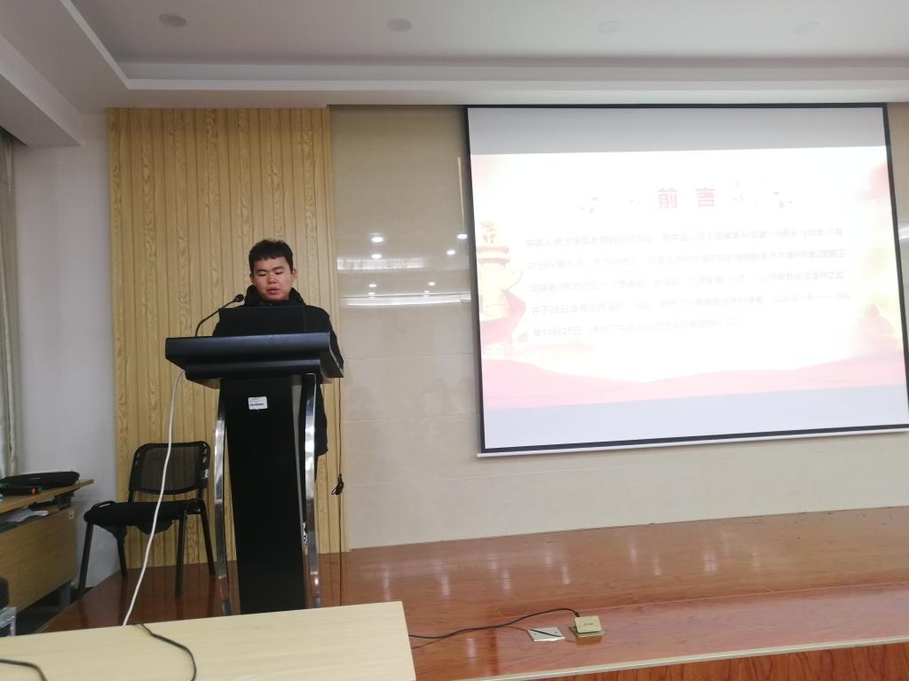 韦孝东以"每一位为祖国奋战的人都不会被遗忘"为主题,带领同学们重温了抗美援朝战争。他指出,正因为志愿军战士们的浴血奋战才得以保卫了祖国的领土安全,同时,这场战争也打出了我国的国威和军威,提高了国际声誉,使敌对国家再不敢对中国发起挑衅。战则存,牺牲在我,国有殇,山河无恙!是每一位为祖国奋战的人将黑暗挡在了身后,是他们迎来了今天的盛世中华。