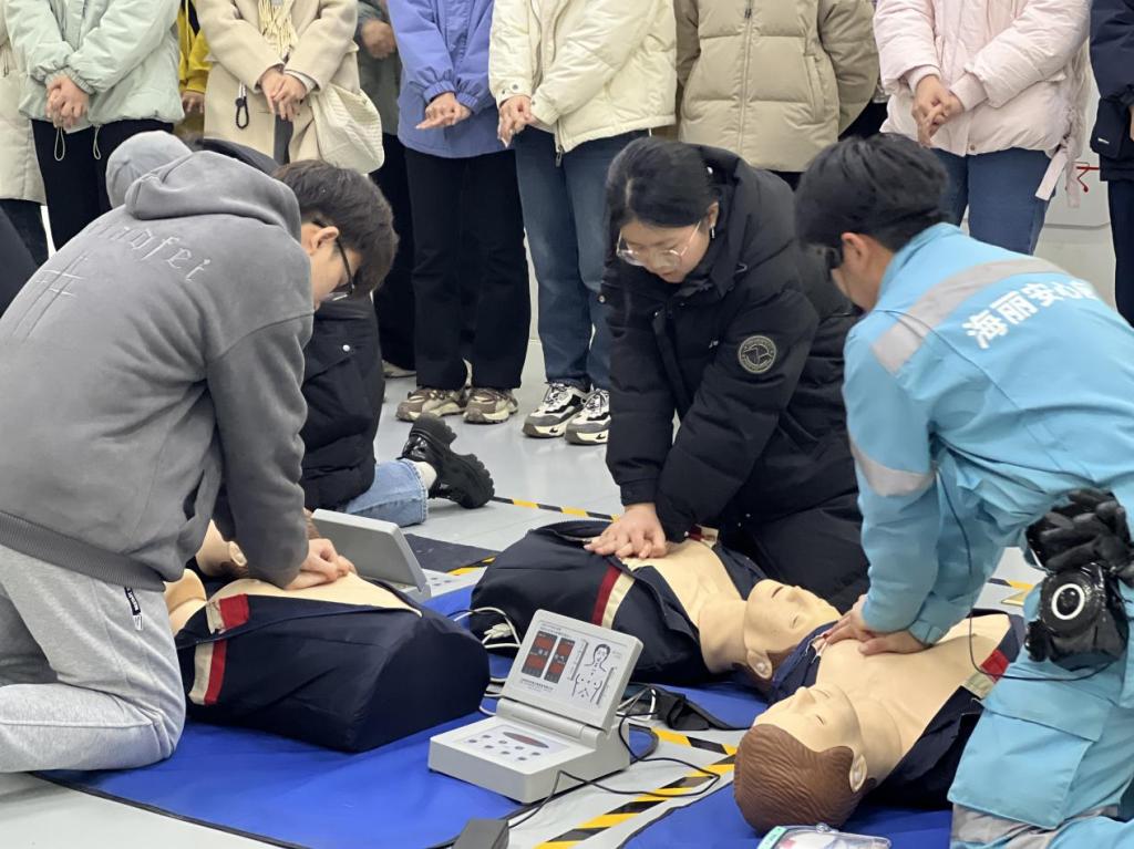 培训现场,在专业人员的指导下,通过讲解、演示、实操等方式,同学们快速掌握了海姆利克急救法、心肺复苏、交通安全等方面的知识和技能,亲身体验了高空坠落、地震、火灾现场逃生等模拟场景。趣味性的讲解和沉浸式的体验激发了同学们高涨的学习热情,帮助同学们在轻松愉悦的氛围中学到了很多实用的应急安全常识。