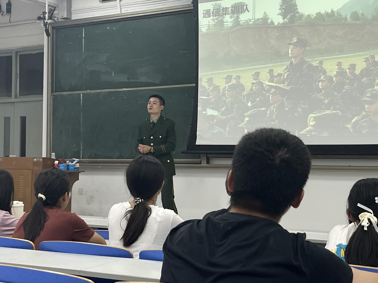 商光先同学则是通过PPT展示了自己两年的军旅生涯,将新兵连的艰苦训练、通信集训队的专业学习、机动中队的实战演练等精彩瞬间一一呈现。从起送军营的初体验,到授衔仪式的庄严时刻;从冬季野营大拉练的严寒挑战,到内务卫生的细致要求;从授枪仪式的神圣时刻,到雪地摔擒、刺杀演练、实弹射击等实战技能的锤炼,商光先用真实的照片和生动的描述,让在场的每一位新生仿佛置身于军营之中,感受到了军人的坚韧与奉献。