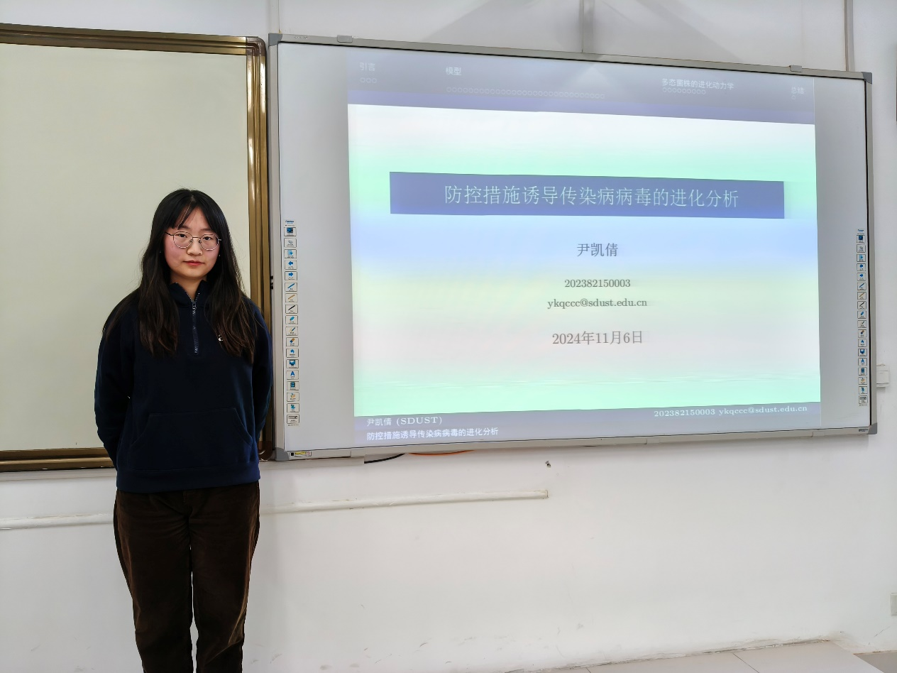 11月6日晚,“数聚西海岸”科学讲堂系列之研究生讲坛第223期在J5-310举行。bevictor伟德硕研2023级数学专业尹凯倩作了题为“防控措施诱导传染病病毒的进化分析”的报告。本次讲坛由院研究生会科技部王钰主持,并邀请信息与计算科学系常正波老师为点评嘉宾。
