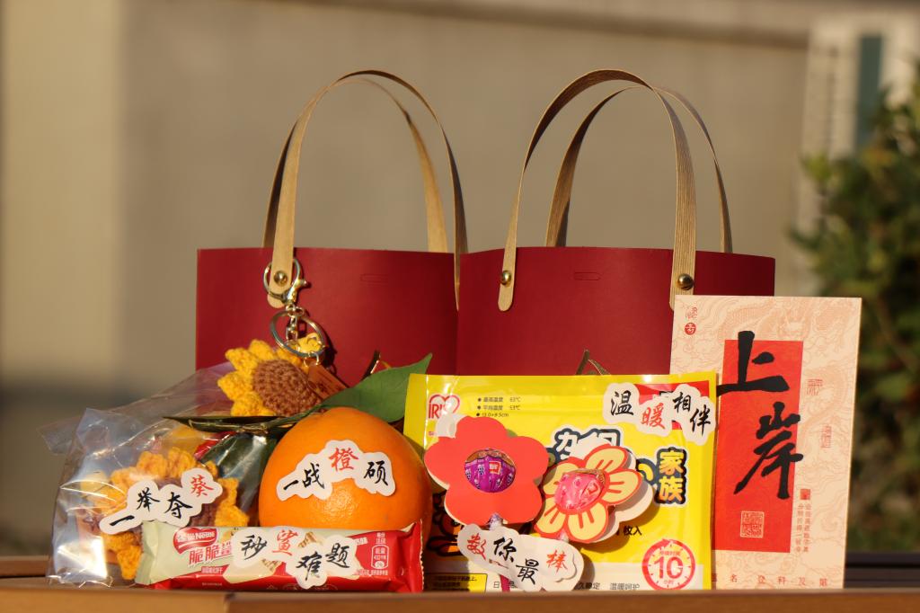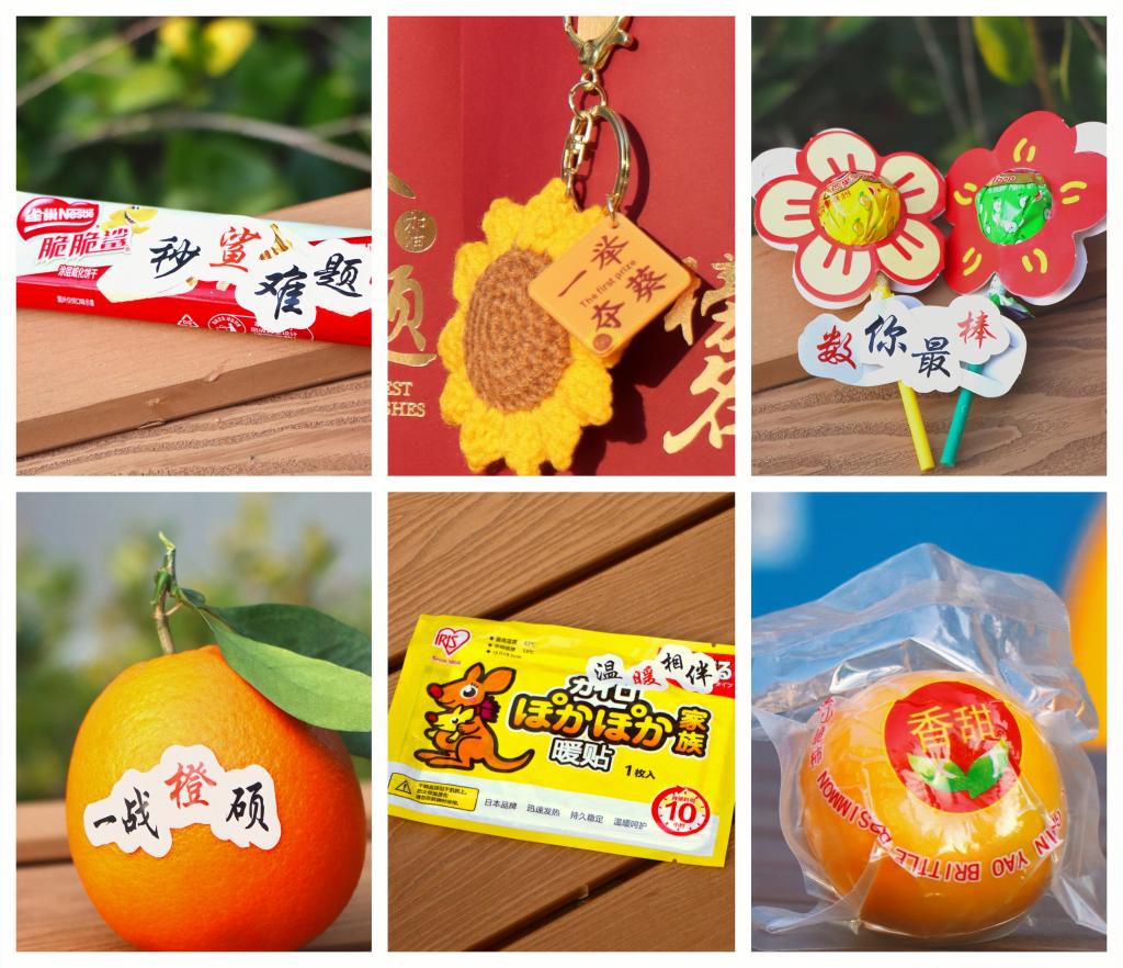 礼包内有学院老师们的温暖祝福和贴心关怀,也有一系列寓意深远的小礼物:一战“橙”硕寓意的橙子,心想“柿”成寓意的柿子,一举夺“葵”寓意的向日葵钥匙扣,温“暖”相伴的暖宝宝,还有“‘数’你最‘棒’”的棒棒糖,从选择礼品、策划创意到分装、发放,全部由学院的师生们亲手完成,希望每位考研学子都能顺利应考,出色发挥,一战上岸。